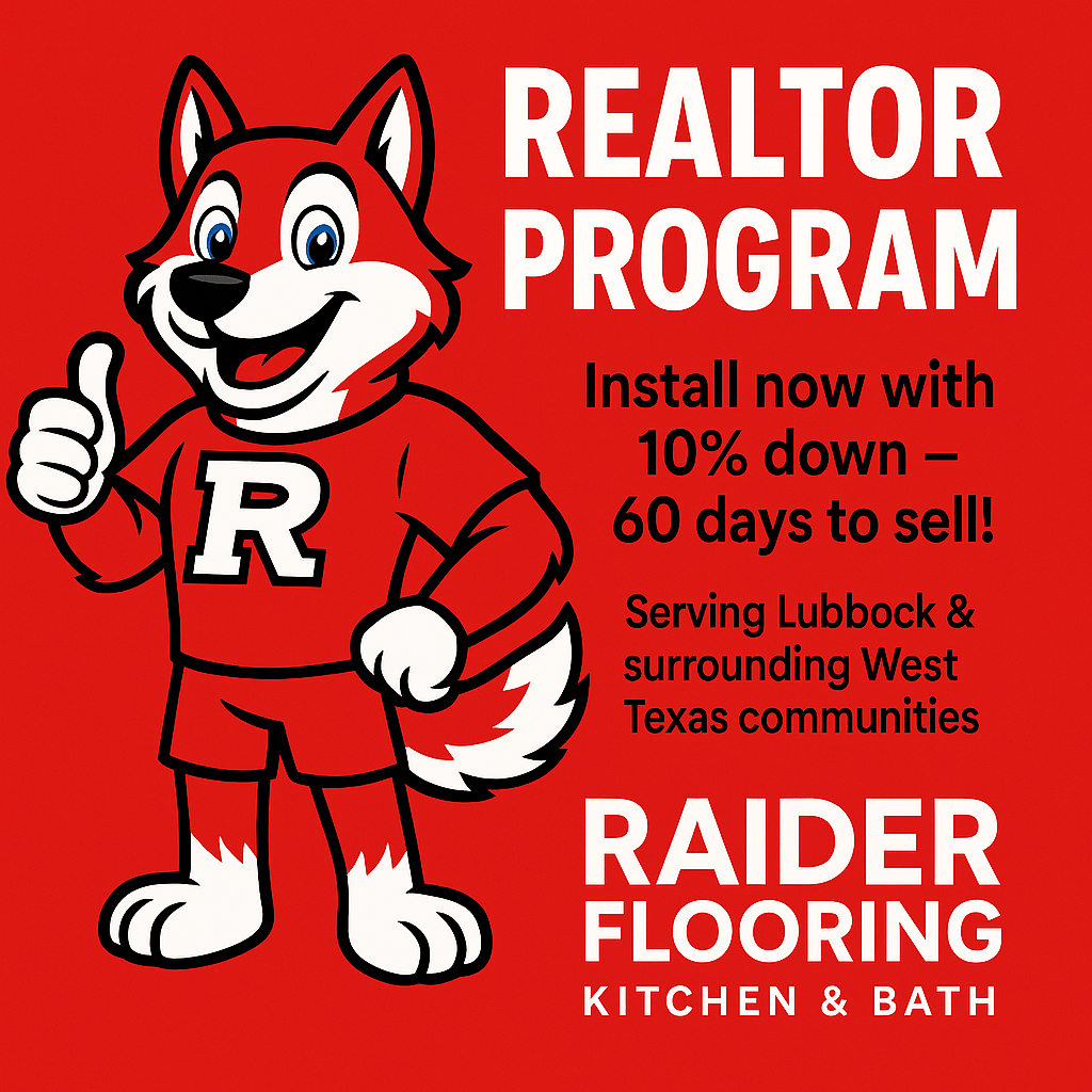 Realtor Flooring Program in Lubbock & Surrounding West Texas Areas At Raider Flooring Kitchen & Bath, we help realtors and home sellers make listings more appealing, sell faster, and command higher offers. Our Exclusive Realtor Program gives sellers the chance to install beautiful new flooring now with just 10% down — and enjoy 60 days…