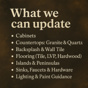 Includes Cabinets + Granite/Quartz CountertopsUse this to budget from our published guide. Final quotes depend on your exact layout, selections, and site conditions.